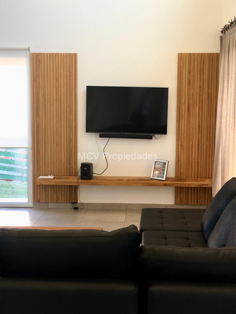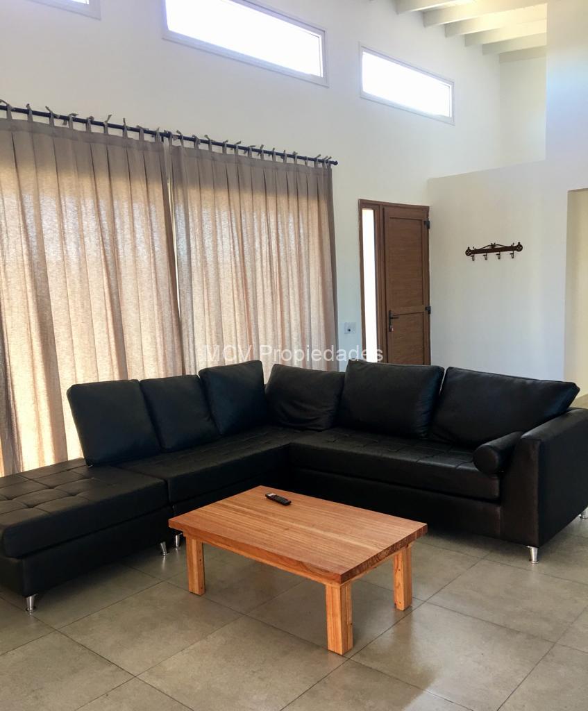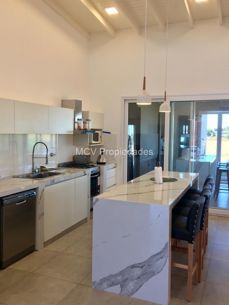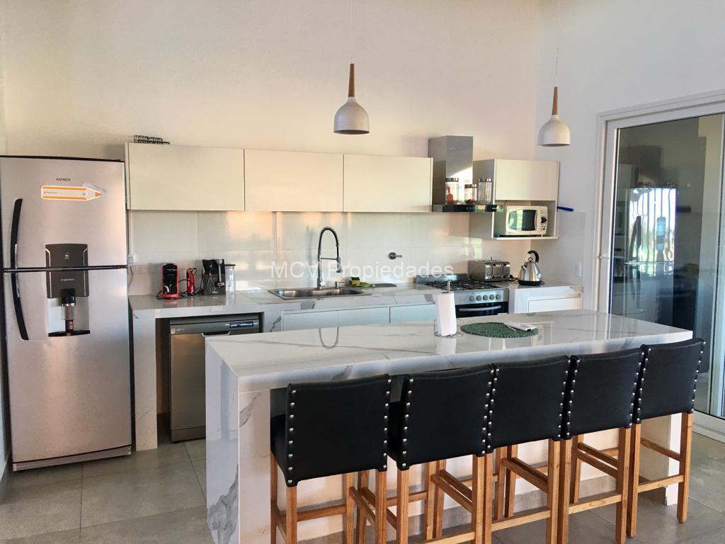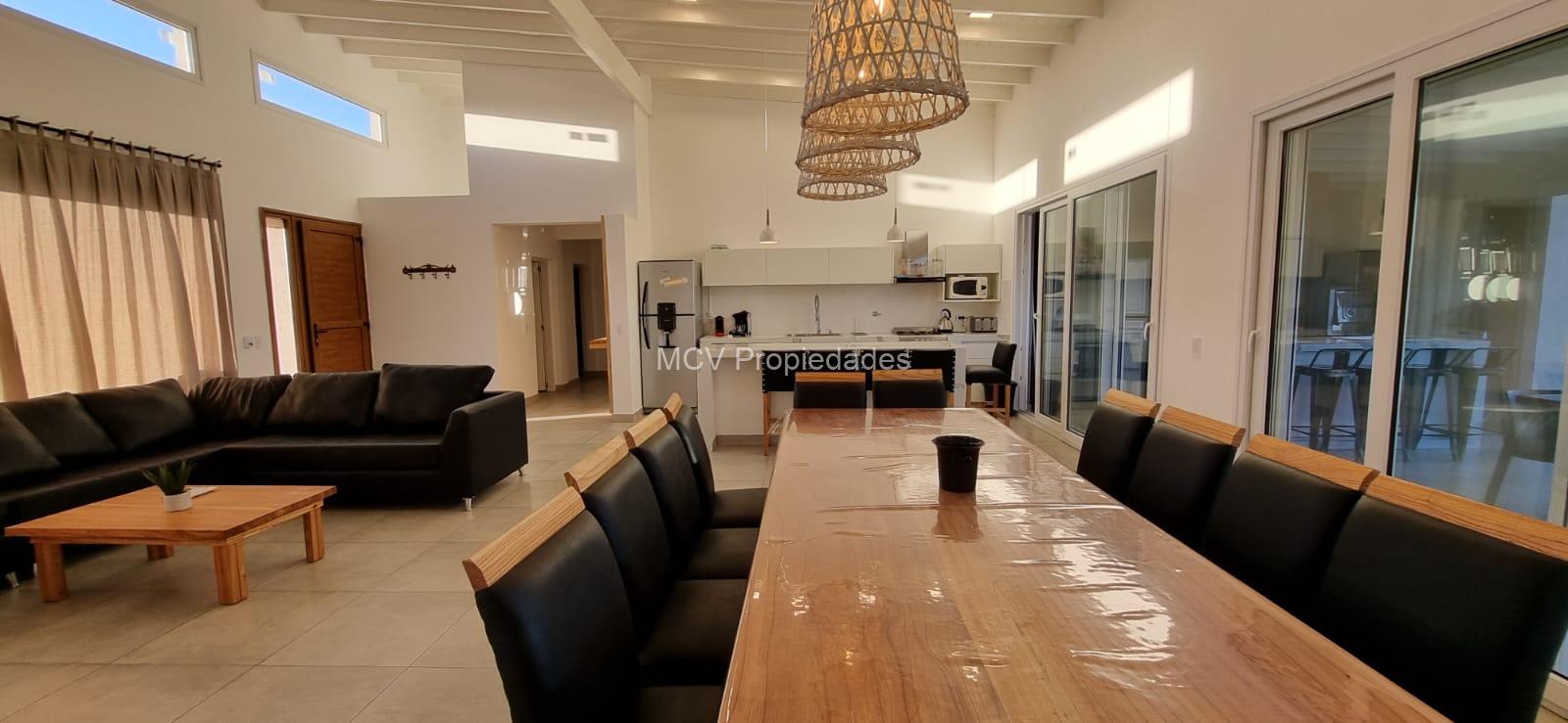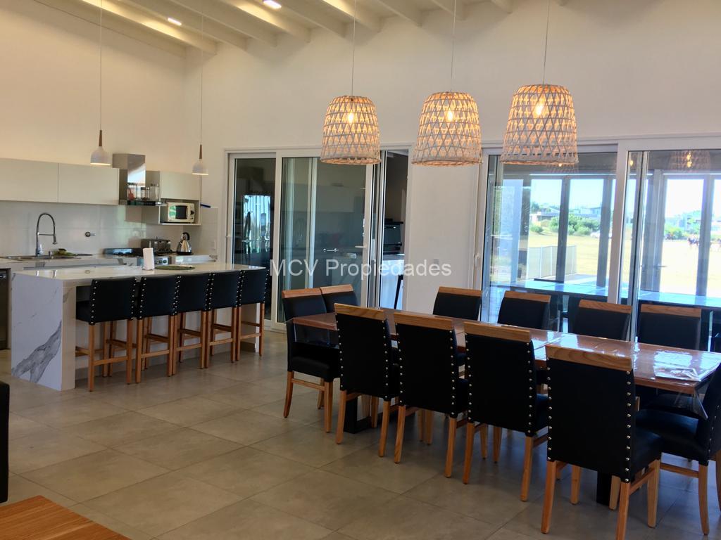 Casa cómoda, luminosa y funcional desarrollada en una planta con vista privilegiada a la cancha de polo; tiene un amplio living-comedor y cocina con barra integrados, 5 dorm, 3 en suite, 4 baños, lavavajillas, WIFI, salamandra, AA en el living y ventiladores en los dorm, 1 tele, heladera adicional, mosquiteros en el living y en la suite; galeria con parrilla y horno pizzero.
