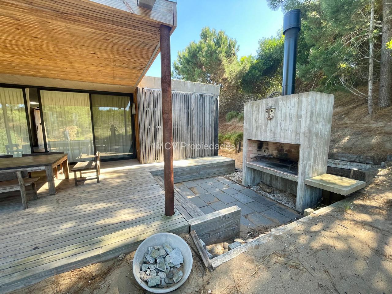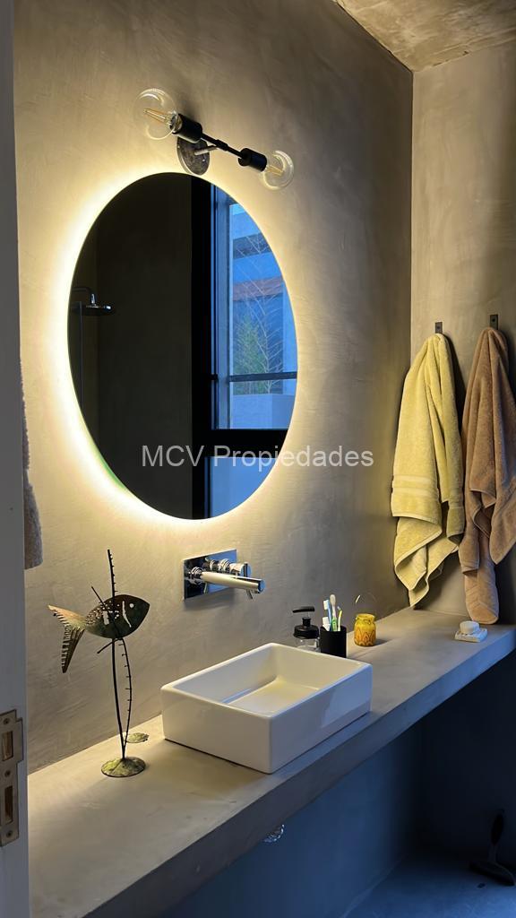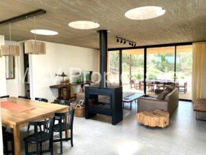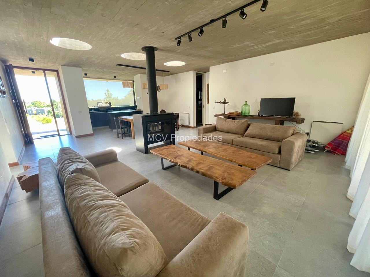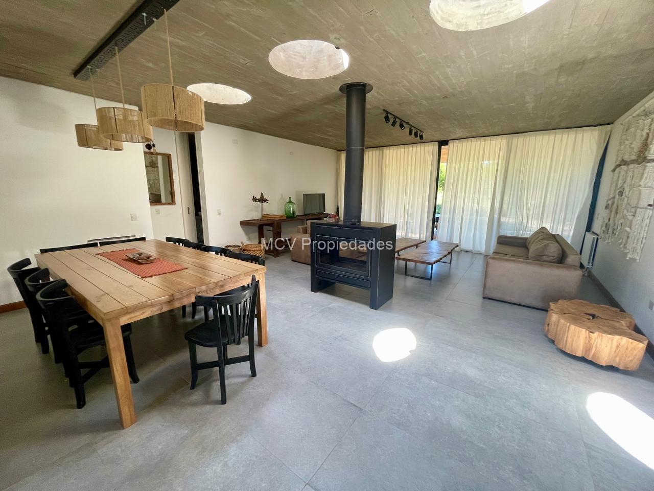 Casa super-moderna desarrollada en una planta, living con salamandra, cocina con barra integrados, 4 dormitorios en suite, calefacción por AA y placas ceramicas, 1 tele, mosquiteros. Galería con parrilla.