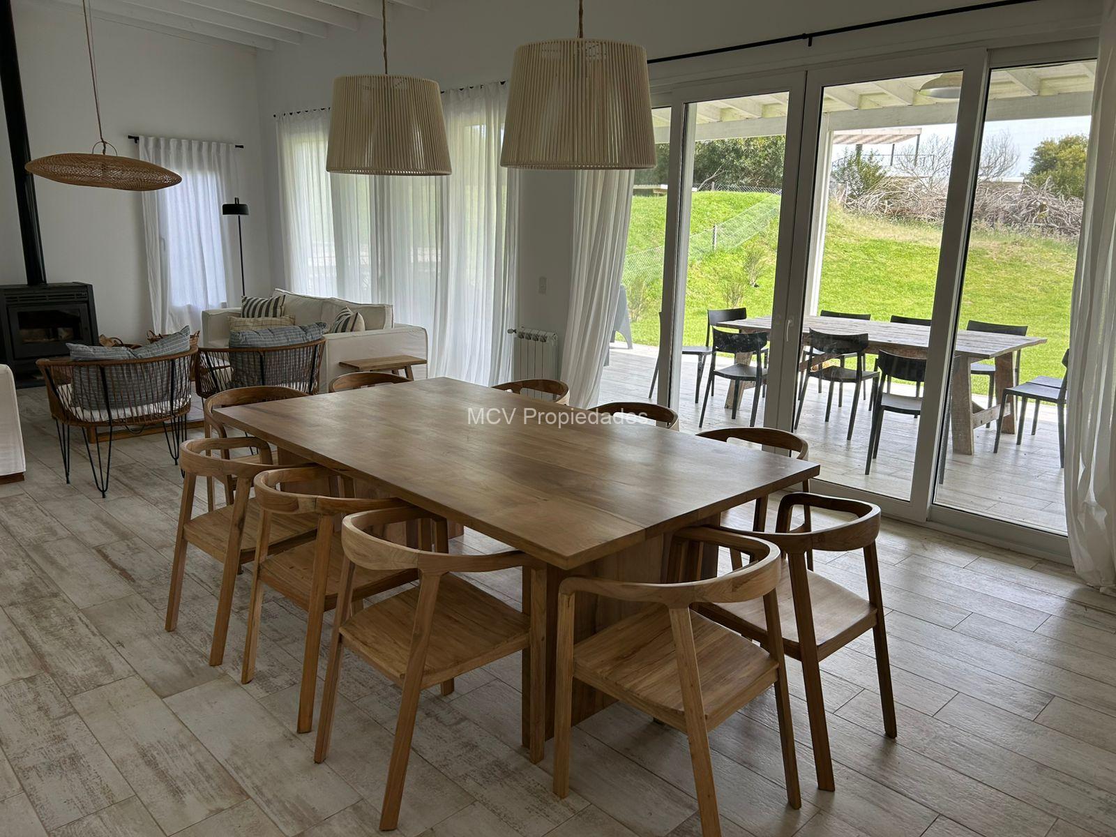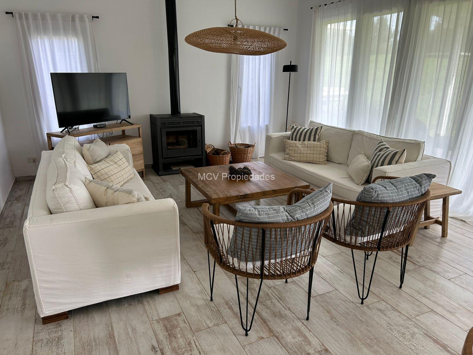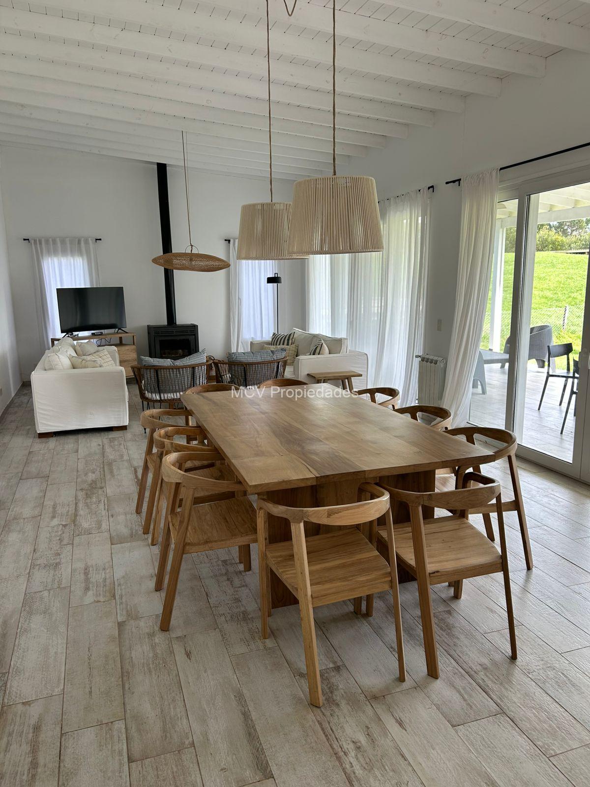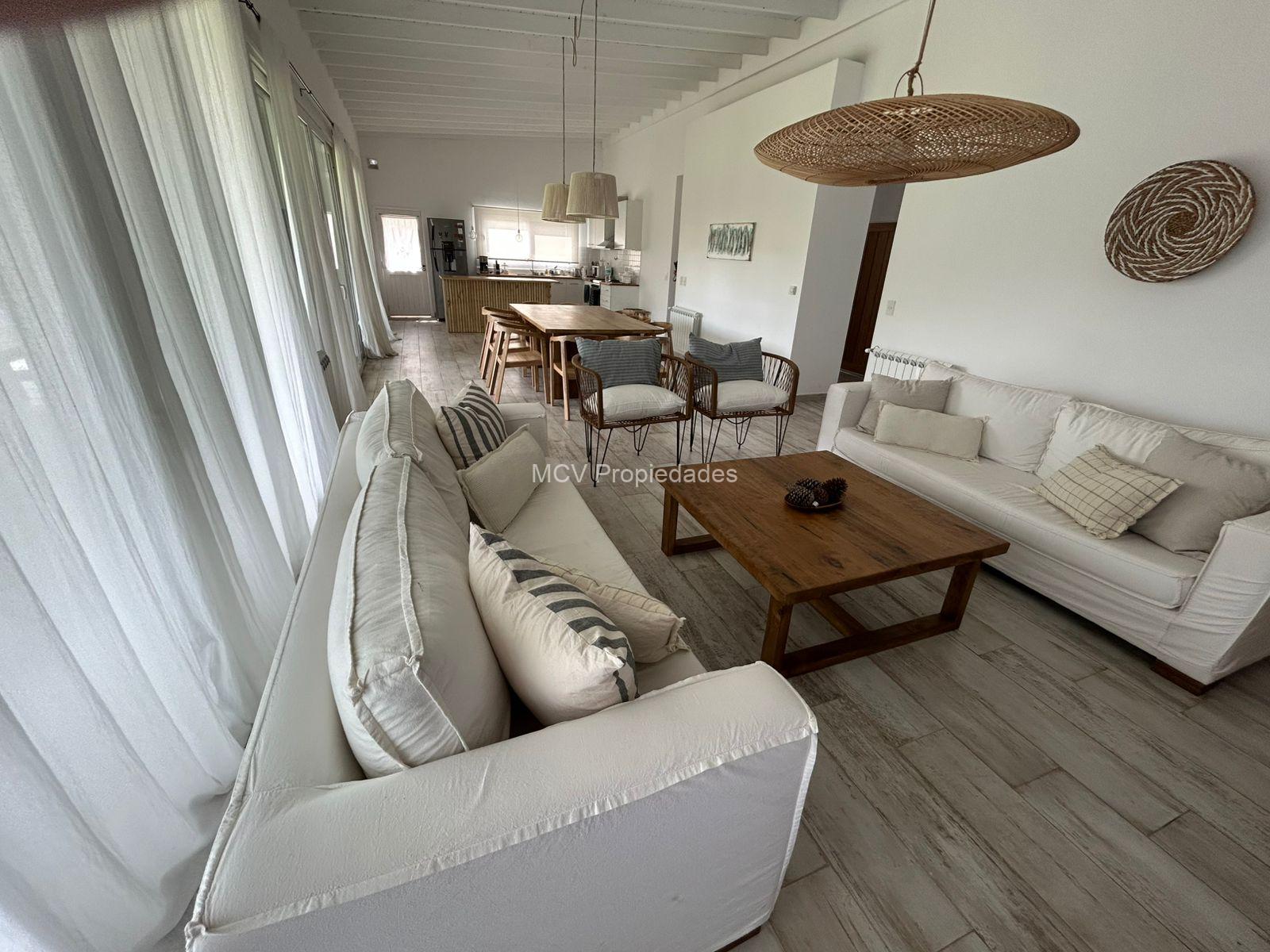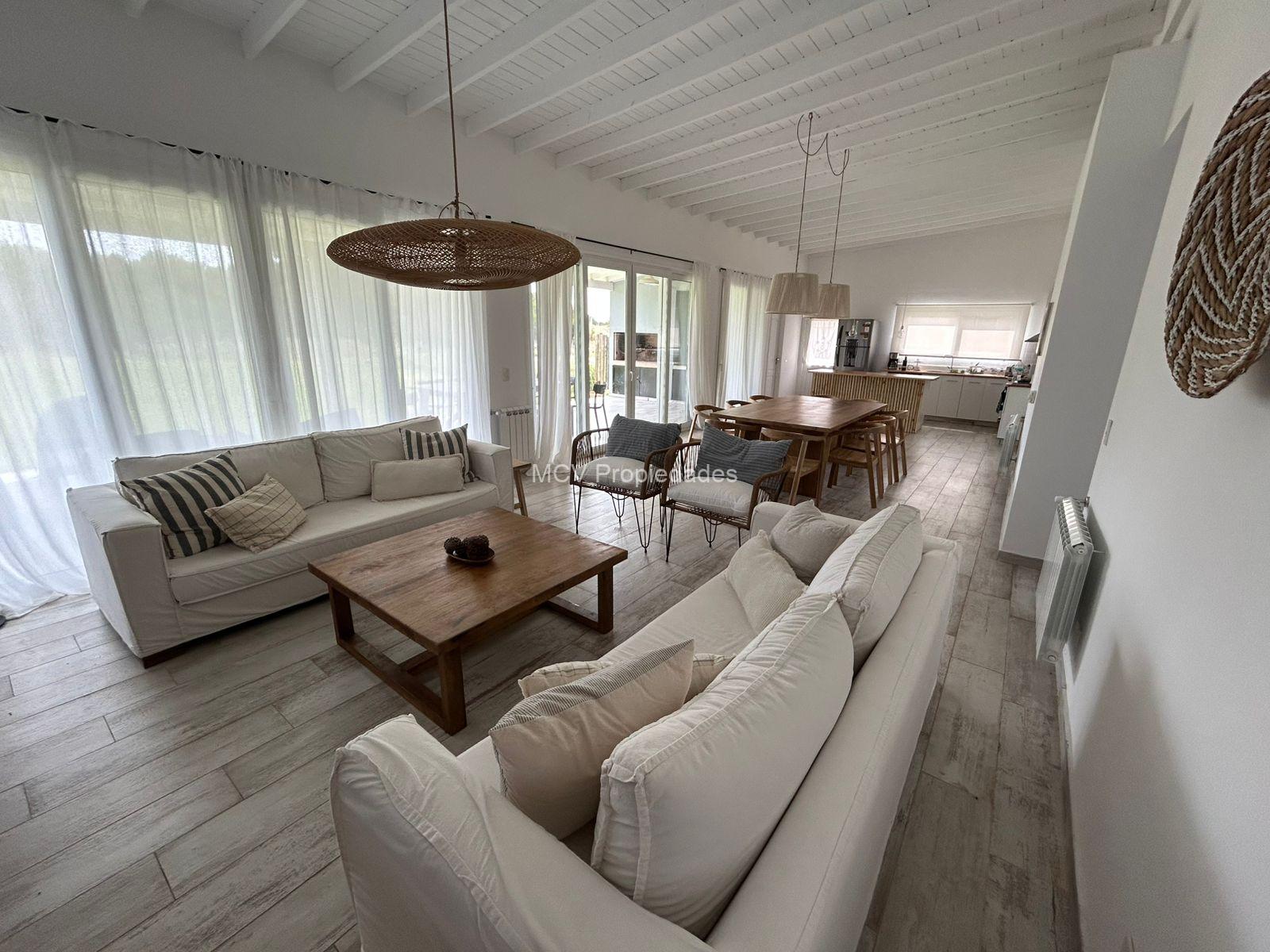 Casa moderna y fresca desarrollada en una planta. Amplio y luminoso living con salamandra,-comedor y cocina con isla integrados, 3 dormitorios en suite (uno de los baños tiene doble entrada. AA en todos los ambientes, lavavajillas, WIFI, 2 teles. Lavadero.